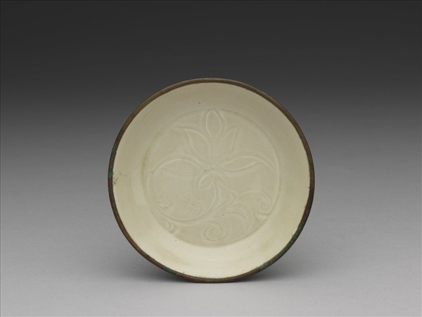 侈口淺壁平底小盤,全器滿釉僅口部鑲銅稜釦。器底心劃萱花一枝。這是定窯瓷器中最常見的一種,在金代窖藏、墓葬中最為常見,如陳慶夫婦墓(1159)、馬令夫婦墓(1184)均見相似文樣。簡單的圖樣,勾勒數筆,便充滿全器面。刻劃的匠工熟練的以順向刀筆與回鋒的變化,將深斜的片狀陰影與銳直的線條,構成筆描與暈染共呈的效果,畫意流暢,而每件作品均熟練而自在,各有細節的差異。