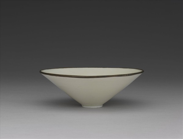 斗笠式碗盞,壁深斜,廣口、圈足矮小、滿釉,口緣鑲銅稜釦,器輕而薄,素無紋飾。釉色泛青,瑩澤光潤,積釉處作湖水碧。此種盈握斗笠碗,為宋人茶盞。李廌(1059-1109)詩有「也容雙井白過瓷」句,自註:「江南雙井,用鄱陽白薄盞點鮮為上。」則北宋中期人用景德鎮青白瓷飲茶,知其器薄,且視之為白瓷。