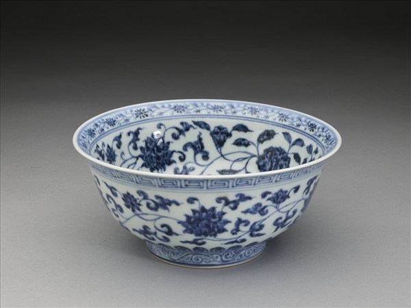 侈口窄唇,深壁,矮圈足。碗內口唇上畫轉枝菊花一周,內壁畫纏枝四季花五朵,碗心畫番蓮一枝。外面口沿下畫回紋一道,周壁畫纏枝番蓮五朵,底邊畫蓮瓣紋,足圈畫卷草紋。內外花紋間加飾青線十一道。底有青花書「大明宣德年製」六字二行楷款,外加雙圈。
