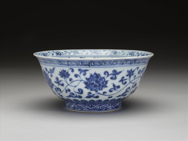 侈口窄唇,深壁,矮圈足。碗內口唇上畫轉枝菊花一周,內壁畫纏枝四季花五朵,碗心畫番蓮一枝。外面口沿下畫回紋一道,周壁畫纏枝番蓮五朵,底邊畫蓮瓣紋,足圈畫卷草紋。內外花紋間加飾青線十一道。底有青花書「大明宣德年製」六字二行楷款,外加雙圈。