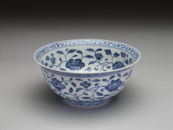 侈口窄唇,深壁,矮圈足。碗內口唇上畫轉枝菊花一周,內壁畫纏枝四季花五朵,碗心畫番蓮一枝。外面口沿下畫回紋一道,周壁畫纏枝番蓮五朵,底邊畫蓮瓣紋,足圈畫卷草紋。內外花紋間加飾青線十一道。底有青花書「大明宣德年製」六字二行楷款,外加雙圈。