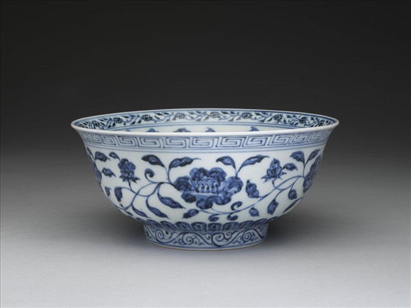 侈口窄唇,深壁,矮圈足。碗內口唇上畫轉枝菊花一周,內壁畫纏枝四季花五朵,碗心畫番蓮一枝。外面口沿下畫回紋一道,周壁畫纏枝番蓮五朵,底邊畫蓮瓣紋,足圈畫卷草紋。內外花紋間加飾青線十一道。底有青花書「大明宣德年製」六字二行楷款,外加雙圈。