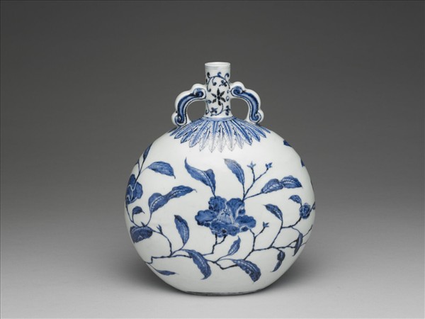 如意耳瓷器扁壺創燒於明代永樂時期,器形來源受到伊斯蘭陶器及玻璃器影響,宣德時期持續燒造,目前可見白釉以及青花二種。其中青花可見以花卉、花鳥、花果以及人物圖作為裝飾者。這件扁壺有小口,細頸,腹部扁圓,平底無足,頸部兩側各有一耳連接頸部和肩部,器腹中央可以見到一道明顯接痕。全器以青花為飾,頸部畫轉枝花卉,肩部飾蕉葉紋一周,蕉葉兩旁略有暈染,腹部兩面各有一株盛開的山茶。