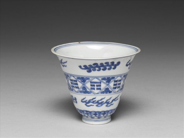 杯侈口,窄唇,弧形深壁,底接圈足。口沿內外及足壁各畫青線兩道,內周壁無紋,底心飾靈芝。外壁中間畫菱形格子,內填八卦與卷草。上下加飾風火紋,底周繪雲頭,內填圖案。外底有「大明嘉靖年製」六字青花楷書款。傳世七件收儲於一個圓筒木匣中。木匣外表淺浮雕兩株折枝梅花,紋樣上端加題清高宗〈每至冬月輒寫寒梅數枝因成短句兩首〉之一。詩文內容是:「索笑巡檐意最 親,依然逢得弄珠人。恰如老幹孤山側,不負年年捷報春」。詩末有「丙寅冬御題」落款(乾隆十一年,1746),鈐一「比德」印。木匣底部另有一「甲」字標記。 依據此組作品「雨」字典藏號,而可追溯出它們原為紫禁城重華宮的陳設品。 對照道光十九年(1839)重華宮《漱芳齋現設陳設檔》中「青花白地磁盞八件(有紫檀木罩匣盛)」,至咸豐二年(1852),被皇帝取走一件的紀錄,而能明白今日僅見七件的緣故。因此,清室善後委員會清點之際方在《故宮物品點查報告》中登錄為「青八卦火燄杯七個(帶木盒嘉靖年製)」。 由於北京故宮收藏有器形與裝飾紋樣均與此七件瓷杯相近,但底款為「大清康熙年製」的作例,故可參照說明此品燒製於康熙朝。據此,再參照院藏嘉靖官窯書款寫法,又可從青花瓷杯底款中的「大」與「年」兩字其實更近康熙款書風,鏈結前述器型特徵,追溯出七件作品底部出現的明朝款識,其實是清初以前朝款識為記的作法。最重要的是整組包裝在乾隆皇帝御筆折枝梅花,和以甲乙丙為文物級別下,深刻地展現出文物等第與包裝的關連。