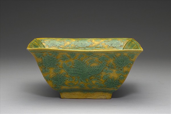 嘉靖時色地加彩瓷器盛行,配色活潑鮮明。其中一例是以嬌黃釉為地,再以綠釉彩凸顯錐劃的紋飾的撇口方形洗。器內口沿錐劃轉枝靈芝紋一週,上下加飾一道綠彩線紋,器內底心以綠彩飾有一鳳一鶴,中飾靈芝及「壽」字篆書款,間隙加飾雲紋,外加方圈。器外壁錐劃二對鳳凰,間飾纏枝番蓮紋,外腹底邊飾有一周蕉葉紋,圈足外壁錐劃卷雲紋,外底施白釉,書有「大明嘉靖年製」青花楷體款識。黃綠釉彩一般在胎體施白瓷透明釉後,再施罩較低溫的黃釉彩及綠釉彩,釉面帶有光澤感;另有一種是白瓷胎不上透明釉,而直接在澀胎上黃彩釉及綠彩釉,因此釉面比較不顯亮度,這兩種技法都需要二次上釉入窯燒造而成。