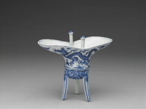 器由爵杯和盤兩件組合。爵杯造型為仿古青銅酒器式樣,橢圓流,尖形尾,雙柱立於口沿弧凹處,三稜形足纖細、微外撇,足底平,無鋬。盤形托座中央突起,外圍三山形支柱,三山之間各有豎槽,底略有邊沿,容置爵杯三足,正相吻合,並使爵杯固定不致移位。托盤折沿,平底,底邊有四如意形足。爵杯外壁下腹近足處突起弦紋一道,弦紋上兩側各以青花畫雙龍雲紋,下則畫波濤仙山紋,腹底邊沿畫雙青圈,正中為雙層六瓣蓮花一朵,惟蓮花與雙圈間隙地,露胎無釉,兩柱釘形圓頂上畫成蓮苞狀,口沿內外、及三足的三稜邊各畫青線二道,內壁白釉無紋泛青。