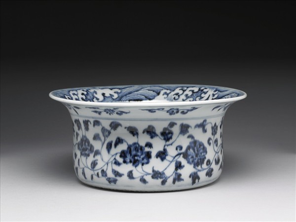 這件青花瓷洗敞口外侈,深壁,平底無足。內底心畫圖案式團花,外圍水波紋,內壁為纏枝四季花卉紋,口沿內繪波濤紋。器外壁畫纏枝花卉紋,佈局錯落有致,外口沿則飾朵花紋一週。明初永樂、宣德時期青花瓷器以進口蘇麻離為彩繪青料,色澤艷麗鮮明,由於釉中錳與鐵的比例影響,青花較濃處帶有滲青斑與鐵褐斑,此器紋飾採小筆點染繪畫,筆法纖細勁挺,注重留白,疏朗清雅。外底無施釉,露淺灰色胎。清雍正、乾隆兩朝官窯皆有仿燒,仿品的裝飾紋樣、燒造痕跡與永樂時期產品有所不同。