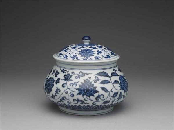 罐口微撇,短頸,器身上斂下碩,平底,矮圈足,帶清代仿製的器蓋。器內口沿以青花圓點一周為飾,外壁繪轉枝花卉紋~牡丹、芍藥、蓮花、芙蓉、菊花、茶花等六朵、底邊一周畫雙層蓮瓣紋,足飾青線二道,頸三道。器內白釉無紋,內底見鏇坯遺痕。器蓋紋飾與主紋相同,亦為轉枝花卉紋,僅畫蓮花、菊花、芍藥、芙容四朵。罐器青花釉色濃豔,多處帶褐黃、鐵褐疵斑。胎骨勻厚,圈足露白胎,質堅細膩,略帶鐵質斑點,胎釉一線呈淡橘紅色。器底直書「大明宣德年製」二行六字楷款,外加雙圈。