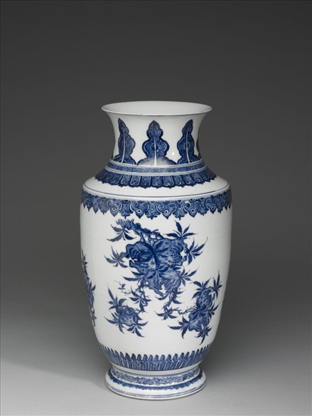 尊,侈口、短頸、碩腹下微歛、矮圈足外撇。胎骨較薄,表面以青花彩繪紋飾,通體施白釉,外底可見若干縮釉小點,足緣無釉露胎。器外口沿繞單弦紋,頸部飾蕉葉紋、回紋及蓮瓣紋各一層,紋飾間以單弦紋作區隔;腹部上下端分別繪如意雲紋及變形蕉葉紋一周,中間有折枝佛手、桃、石榴各一,此三種果實分別含有「多福、多壽、多子」之吉祥寓意,故合稱「三多」;外足圈飾捲雲紋及三角紋各一層、上下加雙弦紋。