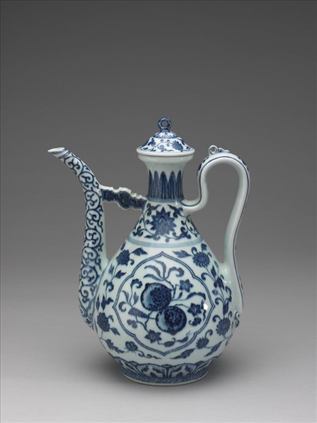 執壺,撇口出唇、短頸、梨形腹、平底、矮圈足,腹一側出曲流、一側附彎把與流相對,把上有一小環,流與壺身間以一不規則雲板連接,帶環形紐子母口蓋。胎骨厚重,表面以青花彩繪紋飾,通體施白釉,足緣無釉露胎。器外壁頸部飾蕉葉紋,肩繪纏枝番蓮,紋飾下方均加三弦紋;腹部雙面各有一菱形開光,內分別繪折枝桃實及枇杷,隙地飾牡丹、番蓮等折枝花卉,近底處繞蓮辦紋一周,外足圈滿繪捲雲紋。曲流多見卷草紋,流口繞雙弦紋二道,與腹壁相連處加飾雙弦紋、內繪折枝花卉;彎把外側繞單弦紋一周,內繪折枝靈芝,與腹壁相連處下方加三枚突起小圓點並飾圈點紋。蓋鈕施青花彩,蓋面以鈕為中心繞蓮瓣紋一周,外圍滿繪轉枝番蓮。底有青花書「大清乾隆年製」六字三行篆款。