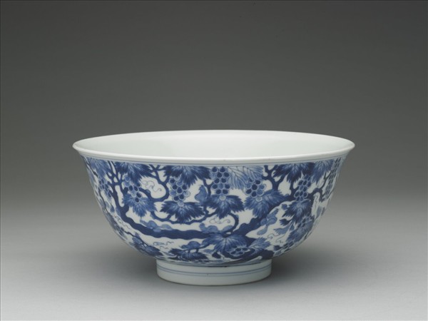 碗,撇口、深弧壁、矮圈足。胎質厚實,通體施青花釉彩,足緣無釉露胎。器外口沿及外足圈各繞雙弦紋一周,腹壁繪葡萄三株,滿飾藤蔓、枝葉及果實,數隻小松鼠嬉戲其間。外底有青花書「大清乾隆年製」六字三行篆款。