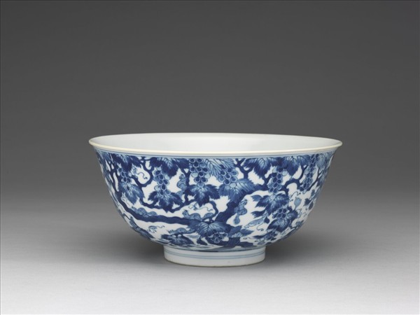 碗,撇口、深弧壁、矮圈足。胎質厚實,通體施青花釉彩,足緣無釉露胎。器外口沿及外足圈各繞雙弦紋一周,腹壁繪葡萄三株,滿飾藤蔓、枝葉及果實,數隻小松鼠嬉戲其間。外底有青花書「大清乾隆年製」六字三行篆款。