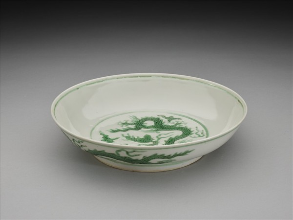 侈口,淺壁弧形,矮圈足。盤心與外壁刻畫雲龍三條,外壁隙地淺劃雙珠、波濤紋。薄胎白釉,龍紋加填綠彩,口足內外分畫綠線四道。底有青花書「大明弘治年製」二行六字楷款,外加雙圈。