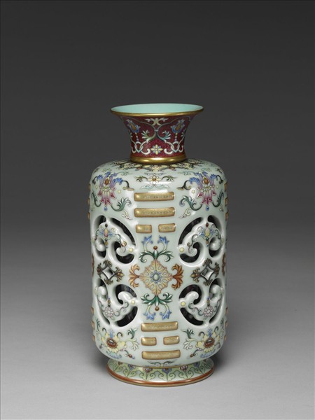 鏤空轉心瓶分圈足、器身、內膽、頸部四段個別燒製,再榫接組裝。瓶撇口,短頸,平肩、圓筒身,撇足。內膽與頸相連,可以旋轉。外層腹部雕鏤四組如意雲紋,間飾八卦及彩繪變形番蓮、銀蓮花等圖案紋,八卦文均突起,其上金彩描繪卷草圖案並描金邊;頸部及內膽為洋紅剔錐錦上添花,足邊冬青地畫如意雲及圖案花一周。器外底冬青地上青花書「大清乾隆年製」六字三行篆款。頸部原裂傷。院藏一對,圖案相同,另一件為故瓷17648「清 乾隆九年 磁胎洋彩八卦如意轉旋瓶」。乾隆八至十年唐英特為清高宗製作新式品種,技法複雜,樣式奇巧別緻。這類鏤空轉心瓶,頸部皆可旋轉,只要撥動瓶頸,內瓶亦隨之轉動,透過鏤空處可見內套瓶紋飾,饒富趣味。《活計檔》上所載名稱為「洋彩冬青玲瓏如意元(圓)式蓍草瓶」,蓍草瓶,又稱八卦瓶,蓍草為多年生草本,古人取其莖來占卜吉凶禍福。明清時代,飾有八卦文的瓶器,一般稱蓍草瓶。
