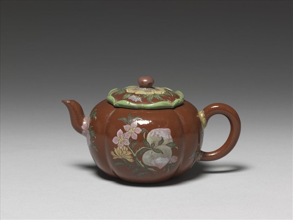 壺形同前略小,僅紋飾及色釉不同。蓋面繪秋葵及雛菊,捲唇蓋沿塗飾嫩綠色;壺外壁兩面棱區畫桃實、桃花,芍藥各二,另二面則繪折枝月季花。胎質略粗,器面全施透明釉。壺底書「康熙御製」四字黃料楷款,外加雙圈。 此壺於《琺瑯、玻璃、宜興、磁胎陳設檔案》內的舊帳名為「宜興胎畫琺瑯萬壽長春海棠式壺,壹件,蓋有缺」。本器的主要紋飾為壺兩面的桃實、桃花象徵長壽,另二面的月季花則象徵長春,是為「萬壽長春」吉祥之意,而壺形呈四瓜棱形,口呈花邊,通稱海棠形,說明此壺就是帳上的「宜興胎畫琺瑯萬壽長春海棠式壺」,而壺蓋小缺數處,與「蓋有缺」亦相符合。
