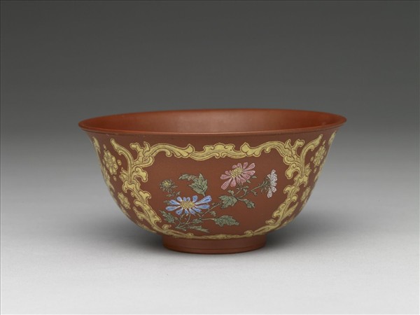形制同前。內壁無紋,外壁紫砂素胎上以黃料描畫卷草紋成三開光窗形,窗內繪飾折枝菊花、牽牛花等三種花卉。紫砂胎地略粗,間雜黑、黃砂點。碗底書「康熙御製」二行四字黃料楷款,外加框圈一周。院藏康熙紫砂胎琺瑯彩茶器,如茶壺或蓋碗,一般內壁均不施透明釉為定規,外壁則有上透明釉後,再施琺瑯彩;亦有不施透明釉者。此類形制茶碗,不帶碗蓋,而外壁亦不施透明釉。碗壁上三種不同花卉,皆繪同色釉彩,僅以綠葉襯托藍、白彩、及極少桃紅繪飾花卉,簡約樸實,為康熙琺瑯彩茶器之罕見者。此器或名為「宜興胎畫琺瑯菊花茶碗」。