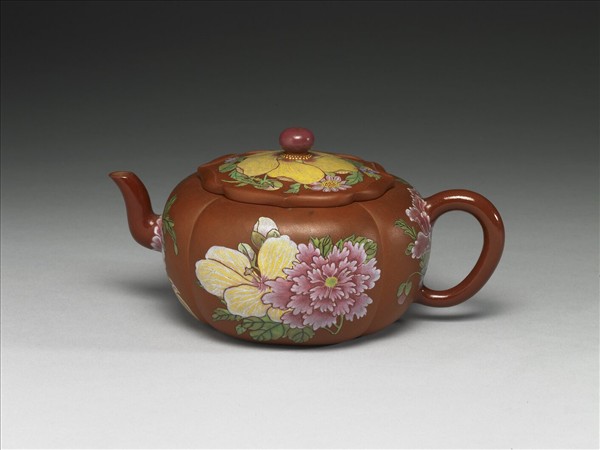 此件茶壺為宜興胎,於蓋紐、流嘴及把手施有透明釉,相較於未施釉的蓋面與壺身,展現出晶瑩的光澤感。器身劃四道稜線分隔出柿形壺的樣式。蓋緣彷如卷邊花瓣,蓋面畫黃色芙蓉,每一片花瓣並以細線勾繪紋理,線條流暢、細緻。壺身每面分飾牡丹與芙蓉,花朵與瓣葉層次分明,線條清晰。壺身以單孔通流嘴。外底無款,在流嘴壺口與器腹連接處下方留有鈐印圓形「壽」字與二方「卍」字印。清宮留存康熙時代的宜興胎琺瑯彩茶具傳世僅十九件,器形主要為茶壺和蓋碗,每件都以細筆作畫,悉數收藏於國立故宮博物院。康熙皇帝主導下的琺瑯彩工藝研究計畫,於探索過程發現琺瑯料較易附著於粗糙的器胎,因而由宜興地方民窯燒造了一批紫砂胎的茶壺與蓋碗送到宮中加飾琺瑯彩,從傳世這批宜興胎畫琺瑯器看來,當時確已能掌握施彩及敷染技法,而讓紋樣皆自然仿真。宜興胎畫琺瑯器首創於康熙朝清宮作坊,後來也隨著全球貿易網絡的流通,成為歐洲各瓷廠競相襲仿的樣式之一。