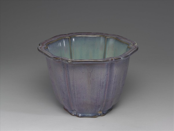 六瓣癸花形,侈口出唇,唇沿邊凸出一道細稜,深腹壁,上豐下斂,器壁依隨葵花式而作鼓起、凹進變化;平底五孔,矮圈足,足圈呼應口沿,亦作葵花形。通體施罩葡萄色釉,器內壁釉色呈天青,口唇以外滿變葡萄紫色,胎厚釉濃,釉質乳濁,釉色深淺不一,施釉至足際,足底緣修釉平整,器底似塗有醬色護胎汁。器表有蚯蚓走泥紋,釉表多縮釉棕眼氣泡。口沿外有舊微傷補,底刻有「四」字。