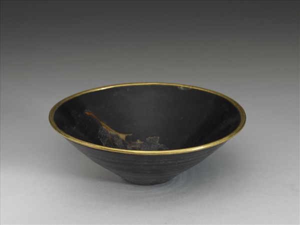 敝瓦式茶碗。侈口,上豐下削,平底,底沿凹刻一周,與底部均露米白色胎,塗赭色薄汁。裏外壁均施明亮的烏黑釉,微泛褐色斑。內壁餘一片葉紋,色黃微帶藍色調;網狀葉脈細膩,葉緣卷起殘蝕。外壁有輪鏇痕。口沿鈐金邊。宋人飲茶好用黑釉盞。當時鬥試茶品,以團茶碾屑,沸水點注、擊拂,則茶場表面面色鮮白,故蔡襄《茶錄》主張「茶色白,宜黑盞」,建安 黑盞,胎厚釉凝,具兔毫、鷓鴣斑之釉變,最受帝王文士之愛賞。南北各地瓷窯,也因此競製黑釉茶盞。吉州窯在江西吉安永和鎮,所製黑瓷有玳瑁斑、鷓鴣斑、剪紙、貼花等裝飾,而葉紋碗則以天然木葉代替剪紙,更難得。敝瓦是一種大型的盞。《格古要論》言︰「古人吃茶湯俱用敝瓦,取其易乾不留津」。南宋《演繁露》謂:「今御前賜茶皆不用建盞,用大湯敝瓦。」建盞多弇口,而定窯、吉州窯盞多侈口敝瓦式。