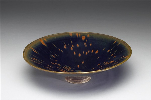 大撇口淺碗、斜壁、小圈足,全器壁薄而輕,足壁銳直微外斜,底挖不足肩。釉色黑亮烏金僅施及壁足交接處;圈足無釉處露白胎,胎骨堅薄,胎外似曾施褐色汁;足裡略施釉不勻。器內滿佈自裡心放射向外的醬柿色點,係以另種含鐵顏料點繪成,筆觸鮮明。外壁黑中帶黃褐色暈斑,偶出一二鐵繪線。