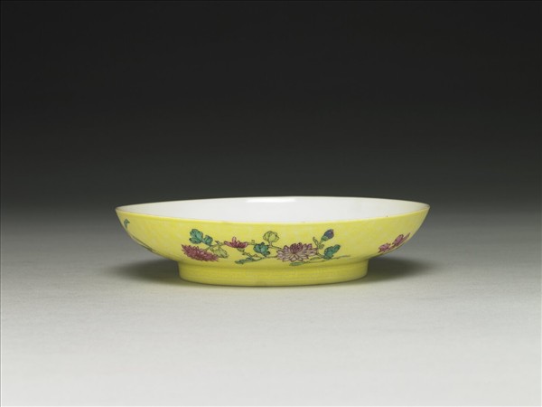 碟侈口,淺弧壁,淺圈足,胎薄透光。外壁黃料淺剔萬字錦紋,錦地之外彩繪折枝四季花卉紋,有月季、罌粟、菊花、百合等;圈足則為丁字黃錦紋。碟心藍料繪山水人物圖,上有墨書題句:「細枝涼夜動,極浦早鴻聲。」紅彩描繪「壽如」「山高」「水長」三白、朱文印。器底藍料書「乾隆年製」四字楷款,外加雙方框。