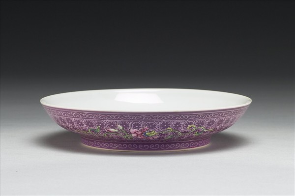 侈口,淺弧壁,平底,矮圈足。器心白地上琺瑯彩繪蘭花、石竹,上墨書題句:「春暖芝蘭花自香」,上下朱紅鈐印「郁心」、「壽」、「奇」三印。外壁茄紫地錐剔六方形錦地花紋,餘隙畫折枝洋蓮二枝,口沿、底邊剔劃卷草文一周,足邊則錐剔如意紋一道,口足留白一道。胎薄透光,底藍料書「乾隆年製」四字二行仿宋體楷款,外加雙方框。