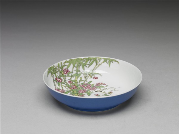 碟,敞口、淺弧壁、矮圈足。胎骨較薄,內壁為白地,以琺瑯彩繪翠竹及野菊生長於坡石間,紅花攀竹盛開,數隻蝴蝶繞花翩翩飛舞;外壁滿施淺藍釉,樸素無紋飾,口沿及足沿各留有一道白邊。外底純白,中央以藍料書「乾隆年製」四字二行仿宋體款,外加粗細雙方框。紋飾與故瓷17014對稱。