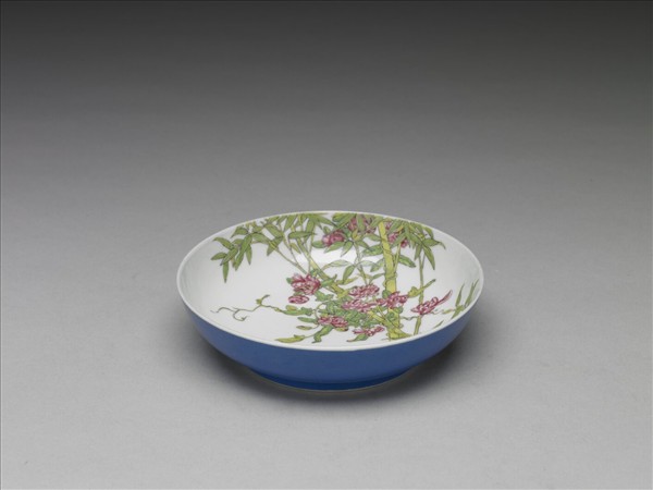 碟,敞口、淺弧壁、矮圈足。胎骨較薄,內壁為白地,以琺瑯彩繪翠竹及野菊生長於坡石之間,紅花攀竹盛開,數隻蝴蝶繞花翩翩飛舞。外壁滿施淺藍釉,樸素無紋飾,口沿及足沿各留有一道白邊。外底純白,中央以藍料書「乾隆年製」四字二行仿宋體款,外加粗細雙方框。