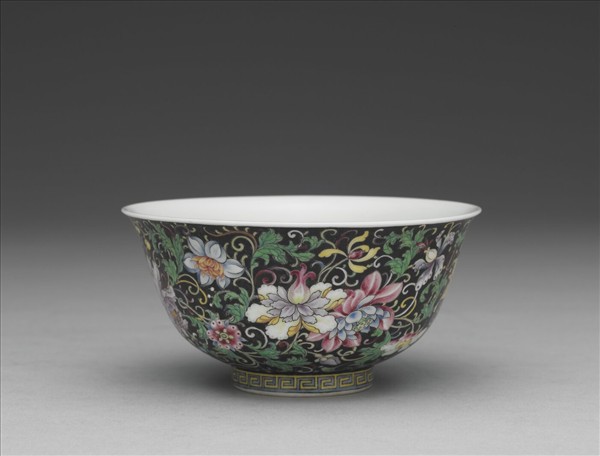 撇口,窄唇,深弧壁,矮圈足。器內施釉,色白光素無紋,外壁以黑彩為地,彩繪牡丹、番蓮等纏枝四季花卉為主紋,主紋之花朵均兩朵一組,分布四面,四組花卉之間搭配多朵小花及枝葉,營造出百花齊放的熱鬧氣氛。外壁口沿留白釉一道。足圈畫黃藍相間之回紋一道。胎地細膩潔白,胎薄透光。器外底青花書「乾隆年製」二行四字仿宋體楷款,外加雙方框。 清代前期康熙、雍正、乾隆三朝作為品茶用的茶碗或茶鍾,其口徑約在十至十一公分左右,有撇口、敞口及直口等。此碗之花卉畫法係採西洋明暗技法描繪,故清宮舊名為「瓷胎畫琺瑯五色番花黑地茶鍾,壹對」。《琺瑯、玻璃、宜興、磁胎陳設檔案》內,記有兩件,與本院所藏相符。這對茶碗另一件(故瓷17023)與本件之造形、大小、款識均相同,紋飾相似,惟花卉種類的搭配果與花朵姿態不同。清代雍正、乾隆朝之瓷胎畫琺瑯器上的構圖雖常成對,但紋飾細節、畫樣佈局常同中有異。