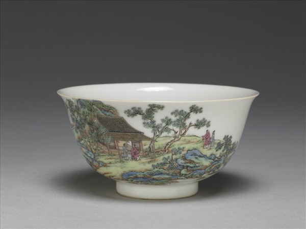撇口,窄唇,深弧壁,矮圈足。碗內白地無紋,外壁一面畫山水人物,背山面水,竹林小屋,一士人坐於屋內休憩,一僮旁侍,屋外橋邊二人駐足交談,一人指向屋內,似欲入內,遠山蒼潤,小橋流水,皴石茂林,烘托出一幅清朗宜人的山水人物圖景。碗壁另一面墨書「連村多綠樹,長日轉黃鸝。」前後紅彩書「竹石」、「山高」、「水長」三印。胎質細膩,胎薄透光。底藍料書「乾隆年製」四字二行仿宋體楷款,外加雙方框。本器釉彩設色以青綠為主、黃藍點綴,是一幅精美的的山水人物圖畫,或為宮廷畫匠所繪。此茶碗在《琺瑯、玻璃、宜興、磁胎陳設檔案》內所載名為:「瓷胎畫琺瑯山水人物白地茶碗,壹對」,本院亦藏兩件,山水背景相似,然人物略異,皆為乾清宮端凝殿北小庫內所藏。