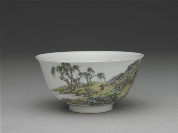 小碗,撇口,窄唇,深弧壁,矮圈足。全器施釉,碗內白地無紋,外壁以琺瑯彩繪飾,畫山水人物,背山面水,竹林小屋,三人對坐於屋前簷下交談,屋外河邊一人戲於柳樹下,一僮在旁嬉戲,小橋流水,皴石茂林,烘托出一幅清朗宜人的山水人物圖景。空白處行草墨書「連村多綠樹,長日囀黃鸝。」前後紅彩書「竹石」、「山高」、「水長」三印。胎質細膩,胎薄透光。器外底藍料書「乾隆年製」四字二行仿宋體楷款,外加雙方框。 本器釉彩設色以青綠為主、黃藍點綴,是一幅精美的的山水人物圖畫,或為宮廷畫匠所繪。此茶碗在《琺瑯、玻璃、宜興、磁胎陳設檔案》內所載名為:「瓷胎畫琺瑯山水人物白地茶碗,壹對」,本院亦藏兩件(另一件為故瓷17025),皆為乾清宮端凝殿北小庫內所藏;此對小碗所繪之山水背景相似,然人物略異,畫樣、佈局不同。清代雍正、乾隆朝之瓷胎畫琺瑯器上的構圖雖常成對,但紋飾細節往同中有異。