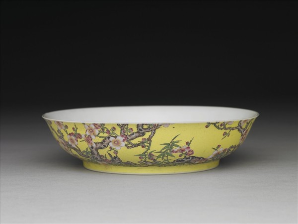 這件盤侈口、淺壁、矮圈足。器內平素無紋,外壁一面彩繪紅白梅花及低矮竹叢,另一面以墨書題「輕盈照谿水,掩歛下瑤臺」詩句,二句出自唐朝杜牧〈梅〉五言律詩之首聯。詩句前有「先春」,後有「壽古」(白文)、「香清」共三枚紅料印。器底帶「雍正年製」二行藍料宋體字雙方框款。
