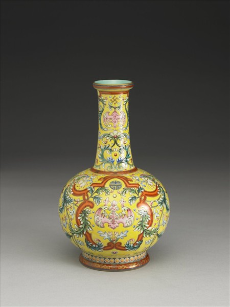 口唇邊,長頸,鼓腹,撇足。全器外壁通施黃地,琺瑯彩繪纏枝番蓮紋,頸部兩連弧葉紋內各畫「卍」字、蝙蝠及番蓮紋,喻「萬福連連」,圓腹以橘紅繪變形如意紋及綠色卷草葉紋交纏呈二開光圈飾,內加飾「壽」字,蝙蝠及半邊的番蓮,開光二側各繪「卍」字、蝙蝠及番蓮紋;口沿、頸肩處及底邊各有紅地描金紋飾、聯珠紋及紅地錦上添花紋數道,口足加繪金邊。器底及頸內施湖綠釉,底心留白框內藍料書「乾隆年製」四字二行篆款,外加雙方框。