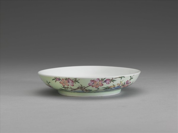 這件碟斂口、淺弧壁、矮圈足。器內平素無紋,外壁施淺綠色釉。釉表,尤其題字一面雜質較多。器外壁一面彩繪粉色桃花二枝、低矮翠竹、藍色奇石與多彩靈芝。另一面以墨書寫有「暎水卻疑乘浪煖,綠崖故是倚雲栽」詩句,二句引用自明朝申時行〈桃花〉七言律詩之頷聯。詩句前有「佳麗」,後有「金成」、「旭映」共三枚紅料印。器底帶「雍正年製」二行藍料宋體字雙方框款。