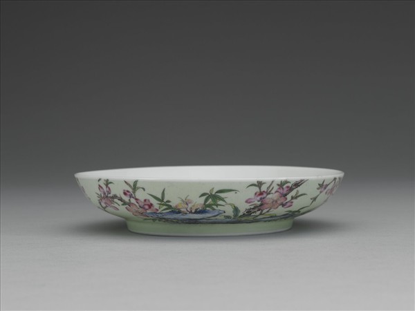 碟,敞口,淺弧壁,矮圈足。器外壁以淺綠釉為地並以琺瑯釉彩繪桃花,間飾竹、靈芝與壽石圖案。器外壁墨書題句:「映水卻疑乘浪煖,綠崖故是倚雲栽。」並以紅料描繪「佳麗」、「金成」、「旭映」三印。內壁光素無紋。足底緣露胎,內底書「雍正年製」藍料雙方框雙行楷款
