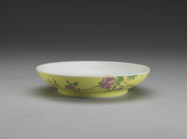 這件碟斂口、淺弧壁、矮圈足。器內平素無紋,器外壁施黃釉,其上繪粉色的月季花。另一面以墨書寫有「朝朝籠麗月,歲歲占長春」詩句,詩句前有「佳麗」,後有「四時」、「長春」共三枚紅料印。器底帶「雍正年製」二行藍料宋體字雙方框款。
