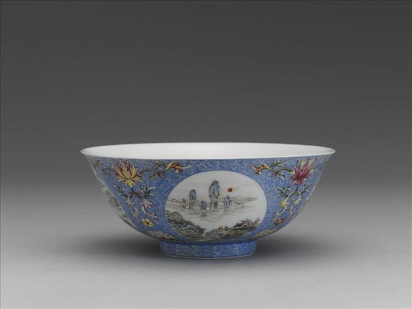 侈口微撇,深弧形壁,矮圈足。口沿及圈足底均留白一道,外壁以淺藍色琺瑯釉為地,並於上錐剔鳳尾形卷草錦紋,隙地帶四圓形開光,內部以墨彩及彩繪畫四景山水與人物。開光之間繪番蓮花與與各式朵花紋。器內周壁光素無紋,碗心繪圖案式八瓣花,花瓣尖端呈如意雲頭形。足底緣無釉露胎,外底書「大清乾隆年製」青花篆書款。據廖寶秀研究,此類器皿外壁上的花朵圖案明顯受到西洋繪畫技法的影響,各層紋飾以琺瑯白料點染光影亮點,表現出明暗立體的效果。