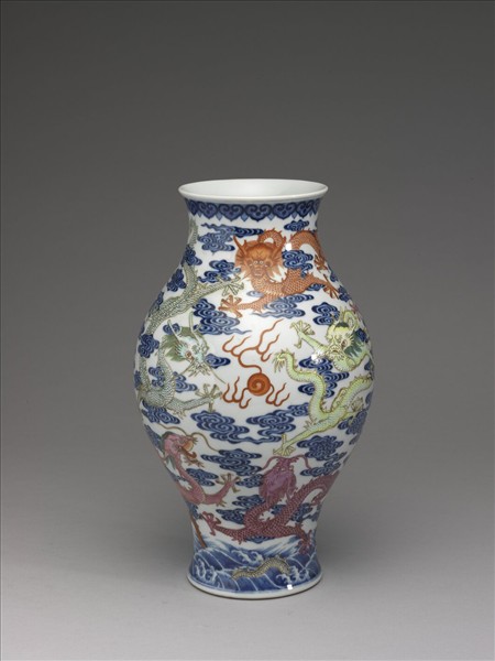 瓶,微撇口,束頸,鼓腹,高足脛,矮圈足。口沿下方飾一圈如意雲紋,器表飾九龍戲珠圖。龍皆為五爪,帶有紅、粉紅、灰、青綠與藍色,皆穿梭游走於祥雲間。器表近底處飾海水波濤紋。圈足底露胎,底書青花「大清乾隆年製」青花篆款。