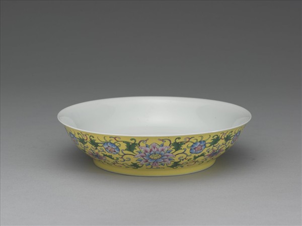 這件盤侈口、深弧壁、矮圈足。器內平素無紋,器外壁施黃地,並以紅、黃、藍、綠等色描繪較為規整、圖案化的纏枝番蓮花紋為飾,器底帶「雍正年製」二行藍料宋體字雙方框款。