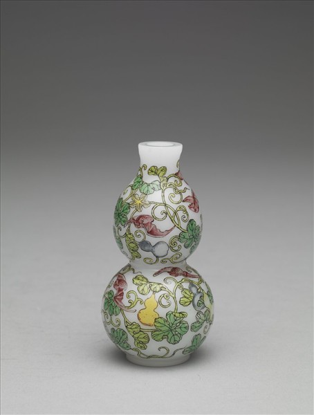 半透明白玻璃葫蘆形小瓶,短頸小口,矮圈足。纏枝藤蔓間綴結黃、紅、藍三色葫蘆,並有紅色蝙蝠飛翔其中。器壁略厚而施色薄,紋飾繁密而不失清透。底有藍料「乾隆年製」楷書款。