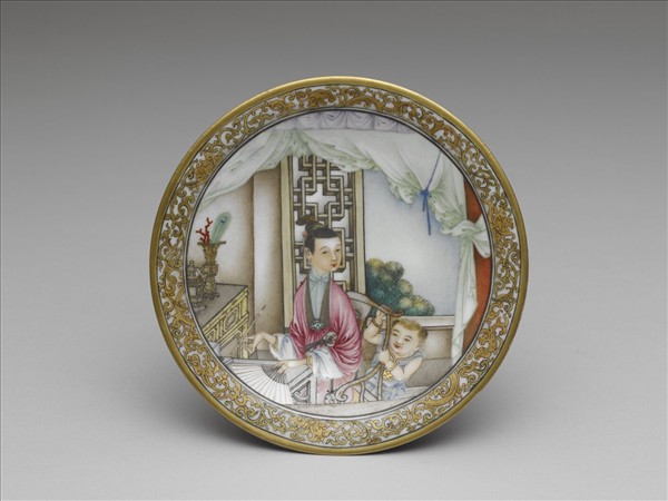乾隆琺瑯彩瓷的人物畫,除了西洋風景與人物特別引人注目之外,課子的題材亦被視為是跟隨著西洋聖母子圖像而出現的作品。此件作品的碟面宛若一幅畫,外圍有細筆畫出的金彩卷枝花草,主畫面呈現室內的一角,母親端坐書桌前,神態優雅嫻靜。她一手持扇,一手執筆,並且側轉過頭來呼喚躲在椅背後面的孩子,孩子的活潑頑皮與母親的端莊典雅恰成明顯的對比。雖然畫的是中國的課子圖,背景的處理,一如西洋風格的作品。所有的物象皆在畫面中盡其所能的描繪出來,舉凡室內裝置的雕花窗戶、窗簾,桌上擺置的青銅器、琺瑯器等一應俱全,睹畫如臨其境。尤其是窗外由點描畫成的樹叢,令人產生印象派畫作的聯想。