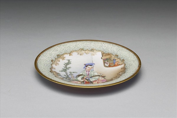 碟敞口,折腰,矮圈足。碟心各以六蝠及六夔鳳紋形成圈飾,圈外琺瑯白料畫卷草錦地紋;圈內主紋各繪一仕女攜子圖,背景飾有湖石、芭蕉、月季,及桂花等點景。外壁各作二段裝飾,上段以藍料繪卷草錦紋,下段為紅地描金卷草紋,卷草紋上均加繪金絲緯線為仿織錦而作,紋飾之間均加畫金線,口足描繪金邊。胎薄透光,底白地上藍料書「乾隆年製」四字二行楷款,外加雙圈。