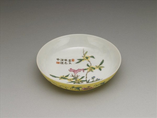 敞口、矮弧壁、圈足。碟心白地上琺瑯彩繪桂花、雞冠花及淡竹葉等三種花卉,上墨書題明代劉崧〈題超上人墨菊〉詩中一句:「露香秋色淺深中」,上下朱紅鈐印「高致」、「秋水」二印。外壁黃地上錐剔方弧繡球及蓮瓣錦紋,餘隙繪轉枝番蓮、野菊、萱花等。三寸碟口徑較小約十一公分左右,畫琺瑯及洋彩均有此製作,然數量不多,乾清宮藏器大多僅作一對,故除本院幾乎不見其他相類器。對碟構成元素雖然相同,然佈局不同,胎薄細緻,尤以錦上添花紋飾細剔精雕,呈現磁胎畫琺瑯對錦地紋飾的講究。