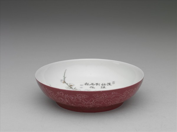斂口,淺弧壁,平底,矮圈足。器外壁以洋紅釉為地,再錐剔纏枝牡丹花紋;碟內心畫山茶花與梅花各一枝,花卉紋上端墨書題句「淡妝蹤影兩依依」,詩句旁紅料描繪「佳麗」、「壽」、「古」三印。胎薄釉白,足底緣未上釉。底有藍料書「乾隆年製」雙方框楷書款。