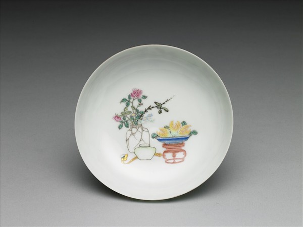 敞口淺盤,矮圈足,以琺瑯彩繪飾,外型淺藍錦地上彩繪蓮紋,盤內底面彩繪博古圖以瓶花、香櫞盤、如意等陳設物,共同呈現吉祥景象。