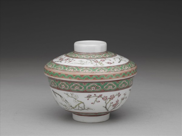 斂口,深弧壁,矮圈足,帶圈頂蓋,蓋沿下折。器外壁及蓋面彩繪紋飾,主紋為折枝紅白梅花共六枝,上下皆加飾綠地描紅如意雲及紅梅一周。蓋面與碗外壁紋飾大致相同,惟蓋邊畫綠地描紅花瓣紋。各層花紋間並加飾描紅雙線。蓋底與碗外底均硃書「慎德堂製」四字雙行楷款。「慎德堂」為道光皇帝在圓明園行宮內的堂號,道光年間有不少以「慎德堂製」為款識的各種器物,蓋碗尤多。