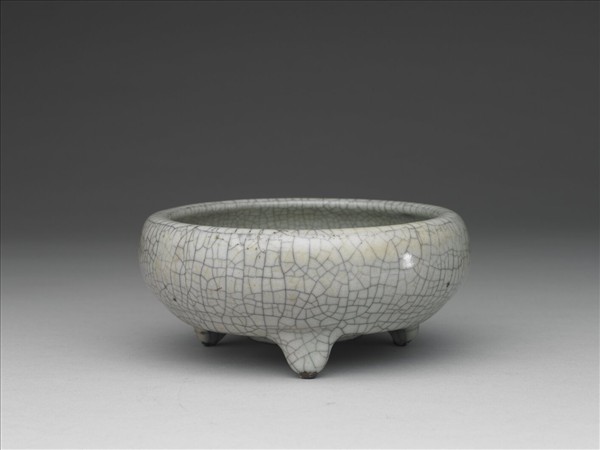 圓形腹,底接三板形足。通體施灰青色釉,釉表開深褐色與淺褐色網狀紋片,內底有一圈墊燒痕,外底凸起一圓形凹槽,足底露黑褐色胎。晚明居室講求古雅的氣氛與情調,通常在廳堂會擺置大件的香爐,而小香爐則放在書齋,此爐尺寸不大,或佈置於書房焚香用。