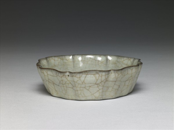 八瓣牡丹花形小洗,侈口窄邊,淺壁,矮圈足。胎質較薄,青色欠潤,口現灰褐色邊,紋片細碎黯淡。底周有六枚支釘痕,露黑色胎。