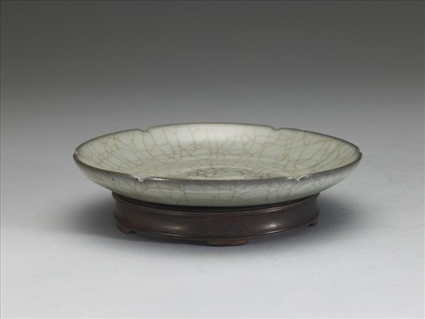 六瓣葵花形,斂口,淺壁,平底,矮圈足。通體施青瓷釉,釉色灰青,釉表開深色細紋片。口沿釉薄,現出灰色邊;施釉至足際,足緣無釉,露出燒後胎色。雖然此一盤式近似於明朝汪興祖墓(1371)的出土物,但考慮到葵口器形,自宋朝以來即流行一時,常見於金銀、陶瓷與漆器之列,再加上老虎洞窯的編年報告尚未正式出版,無法取得進一步可資比對資料;故將之訂年為南宋至元朝。底面鐫刻乾隆皇帝〈詠官窯碟子〉:「掙釘猶是宋窯遺,冰裂紋存泑水滋。一例鳳凰山下土,不經陶鍊孰珍之」御製詩。詩末署「乾隆乙未春御題」紀年銘(乾隆四十年,1775),並落「太璞」一枚鈐印。乾隆皇帝鑑賞之際,為加強說明他對陶瓷燒造背景的瞭解,故於「一例鳳凰山下土」下,特別加注「宋修內司官窯,在杭之鳳凰山下」,表達南宋官窯是他所認同的窯口之一。