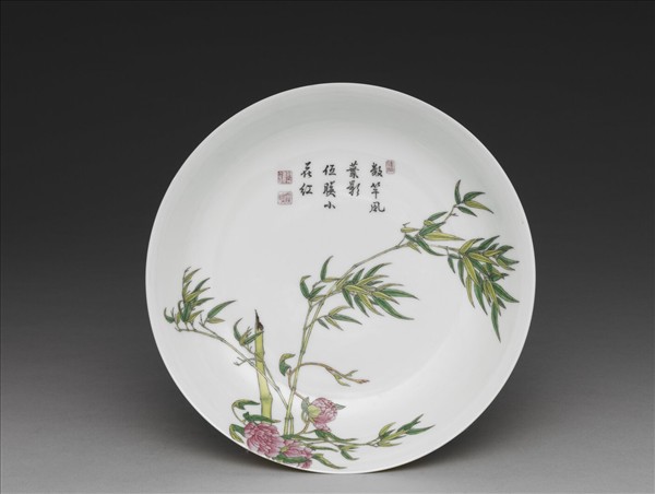 這件盤侈口、緩弧壁、矮圈足。器外壁滿施黃釉,二盤盤心皆自左下方斜上彩繪迎風招展之翠竹,下方盤壁再飾以粉色牡丹。盤面上方空白處以墨書寫有「數竿風葉影,低映小花紅」詩句,二句剪裁自唐朝李咸用〈庭竹〉一詩。詩句前有「佳麗」,後有「翠鋪」、「霞映」共三枚紅料印。器底帶「大清雍正年製」二行青花楷書雙圈款。